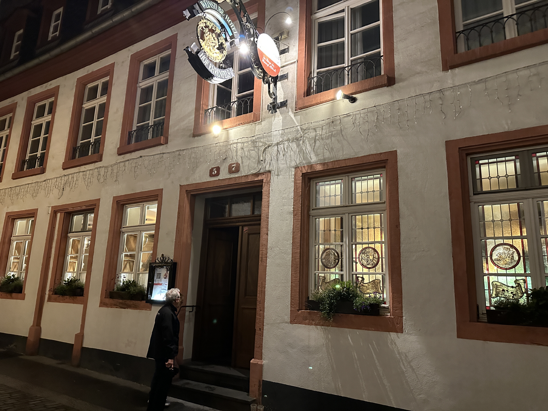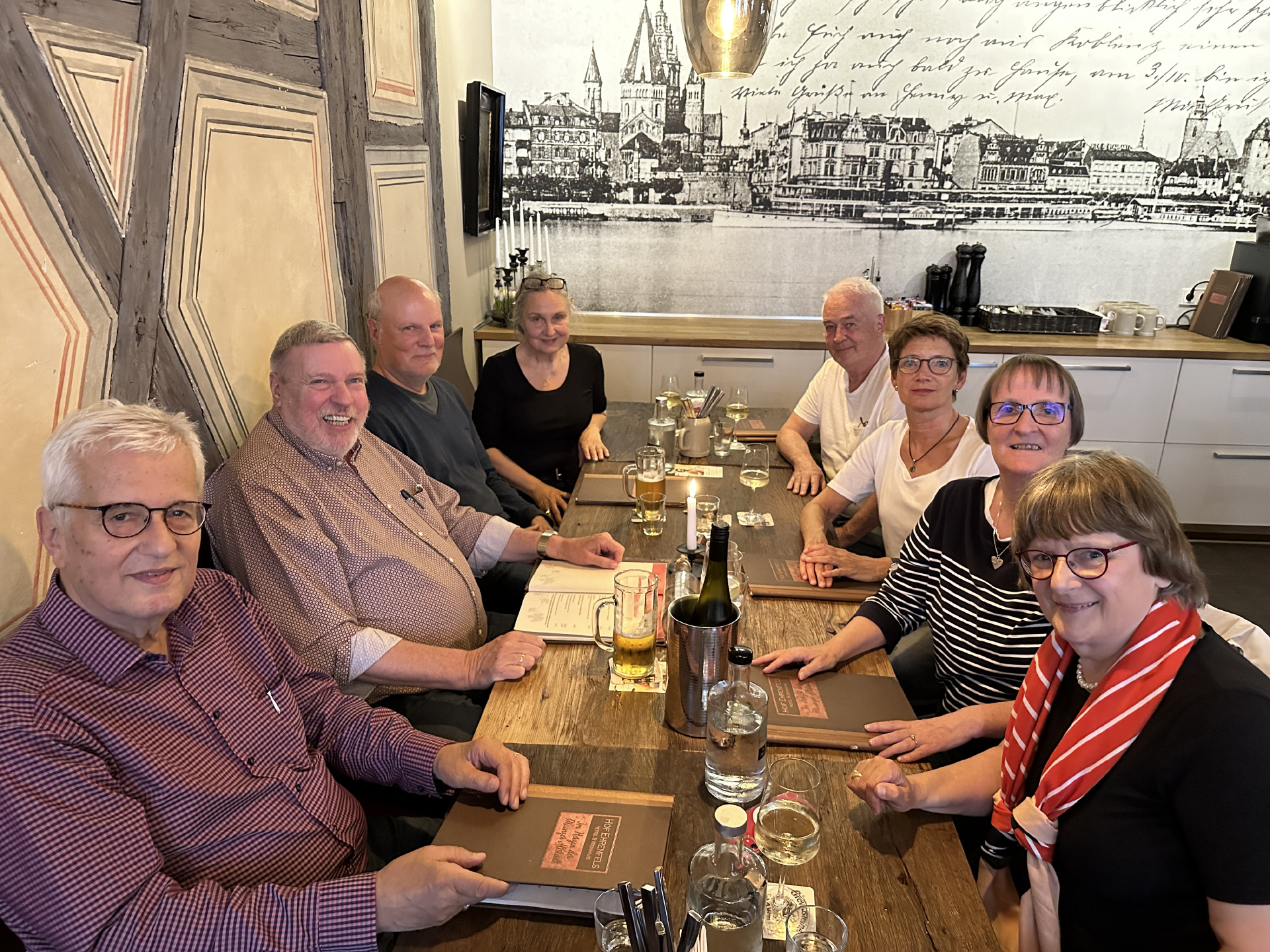 Letzmalig startete unser Treffen am Freitag vor Pfingsten. Bis dass alle eingetroffen waren, war es bereits später Nachmittag und wir konnten dann schnell mit dem Abendessen starten. Unsere Unterbringung, das Hotel Erbacher Hof, liegt äußerst zentral in Mainz gleich hinter dem Dom. Und unser erstes Abendessen erhielten wir in einem Weinhaus nur wenige Schritte vom Hotel entfernt, dem Hof Ehrenfels. An dem ersten Abend waren wir noch mit "nur" 4 Paaren unterwegs, da Gerd und Antje Ehlermann erst am nächsten Tag anreisen konnten. Aber Spaß hatten wir natürlich auch zu acht, wie die ersten Fotos zeigen.